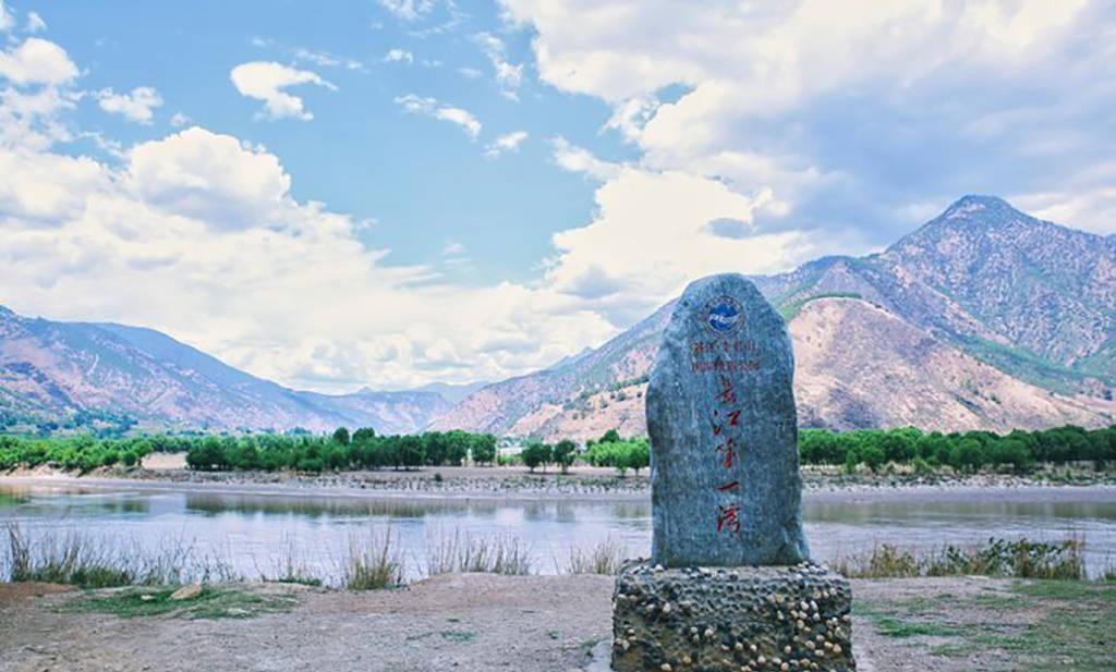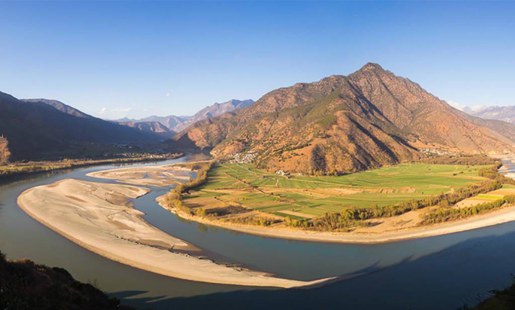 长江第一湾位于丽江石鼓镇与香格里拉县城南部的沙松壁村之间。大海距离1850米。长江从“世界屋脊”——青藏高原奔流而下,到达香格里拉县城沙松壁村。它来了一个100多度的急转弯,转向东北方向,形成了罕见的“V”字形弯道。“大河从这里流回,冲进中原庄关口。”因此,人们称这一奇观为“长江第一湾”。